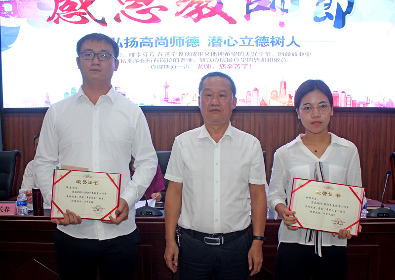 华森糖业公司董事长、学院理事长张家华,公司党委书记、学院执行院长赵海林,公司总经理、学院副院长李玉德,公司工会主席、学院组织人事处处长曾祥明等领导分别为2019­—2020年度优秀班主任、优秀教师、先进教育工作者、2020年四川省职业院校教师教学能力大赛获奖组、希望之星、网红老师颁发荣誉证书及奖金并合影留念。