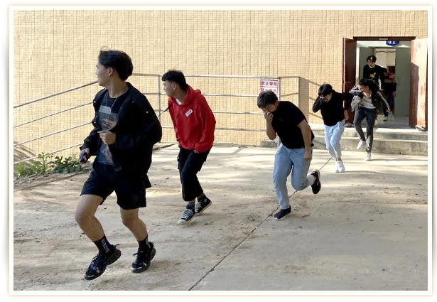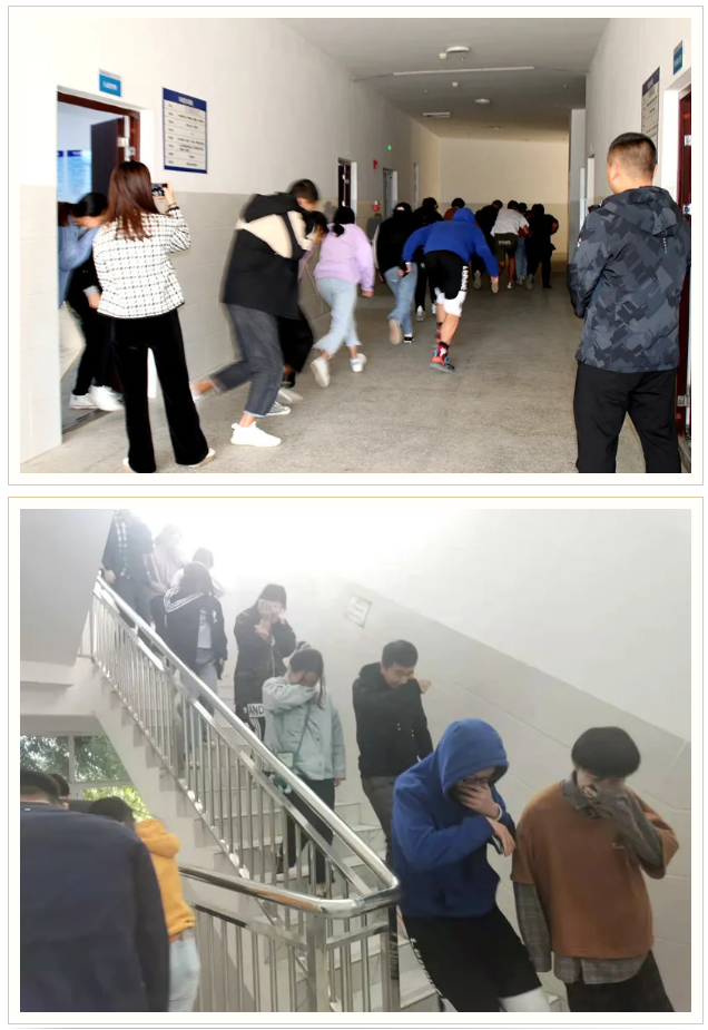 在大家正常上课中,教学楼突然响起急促的警报声,演练正式开始。同学们在任课老师、楼层管理教师、保卫人员的引导下,用衣服、毛巾捂住口鼻,弯腰、弓背,沿预定消防路线迅速、有序撤出教室,安全到达教学楼前避难场所,并马上集合清点人数。整个过程不到2分钟,消防撤离疏散圆满完成。