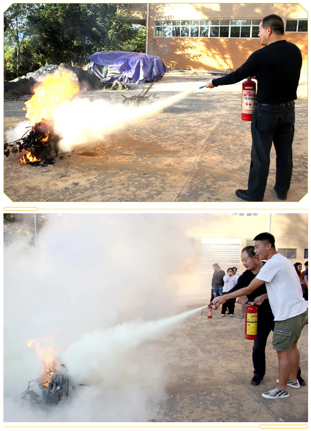 灭火演练开始,保卫处张云友引燃两个柴堆,熊熊大火迅速燃烧起来,倪副处长再次按照灭火流程进行灭火示范。教师和学生代表严格按照灭火流程,有序使用灭火器现场进行灭火实际操作,两个柴堆反复被浇上汽油并引燃,又反复被师生们用干粉灭火器扑灭,大家在反复实践中掌握灭火器的使用方法及灭火技巧。