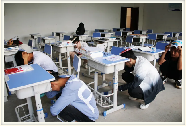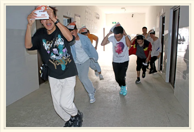 17:30分,消防、防震演练正式开始。当火灾警报声响起时,学生们在上课老师的组织下,用衣服、毛巾等捂住口鼻,弯腰、弓背,沿预定消防路线迅速、有序撤离教室,到达教学楼前的空地集合并清点人数。在地震演练中,当听到地震警报声,同学们迅速躲在课桌下,随后在任课教师的指挥下,用书包、书等遮挡住头部,沿预定撤离路线快速撤离到教学楼前的空地集合并清点人员,完成防震演练。
