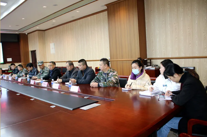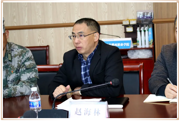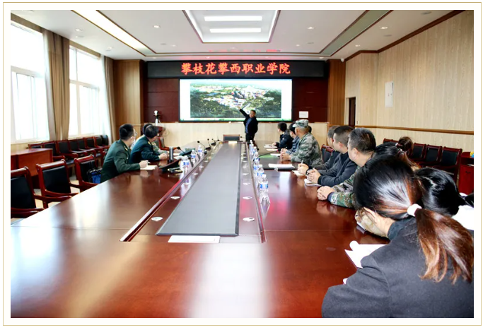 在二实训楼四楼会议室,赵海林代表学院对攀枝花军分区副司令员黄育松一行表示热烈欢迎,就学院发展历程、办学特色、专业结构、生源组成等学院基本情况进行了介绍,重点对学院在落实高职扩招政策下招收退役军人情况,学院贯彻落实征兵工作的具体举措等进行了详细介绍,指出征兵工作意义重大,大学生应征入伍打通了学生成长通道,学院高度重视,并践行“为党育人、为国育才”的使命担当,做好宣传,做好学生思想动员,抓严、抓实征兵工作,高质量、高标准完成征兵任务,争取让攀西职院成为攀枝花军分区优质生源地,为军队输送更多优质生源,为国防和军队现代化建设做出应有的贡献。