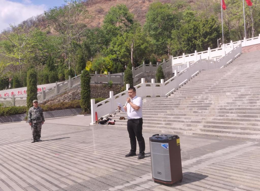 巍巍灵官山,滔滔安宁河。米易县烈士陵园内翠柏掩映,郁郁葱葱,在庄严肃立英雄纪念碑下,全体师生整齐列队,神情肃穆,静静等待活动开始。下午3时30分,活动开始,全体师生奏唱团歌,向烈士纪念碑肃立默哀,团委书记刘兴科同志宣读祭文。