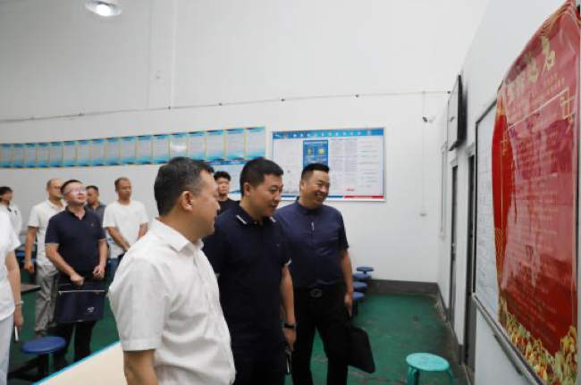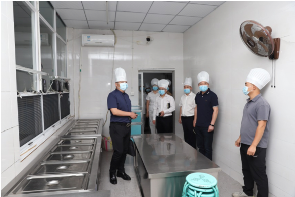专家组组长陈向华(中)一行在潘吉平副院长(前)陪同下在食堂现场检查