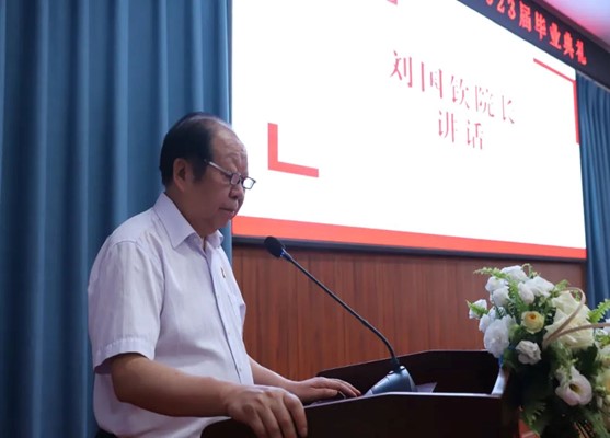院长刘国钦讲话,他代表学院党政和全校师生员工向顺利完成学业的2023届毕业生表示热烈祝贺。他对同学们提出四点希望:一是不忘初心、牢记使命,做一个有担当的人。二是思行结合、躬身实践,做一个实干的人。三是乐观向上、百折不挠,做一个开朗的人。四是心怀眷恋、相伴永远,做一个感恩的人。