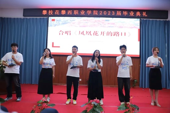 6名师生联袂登台献唱歌曲《凤凰花开的路口》。表达了对2023届毕业生的依依惜别之情和深深祝福,赢得现场阵阵掌声与欢呼。