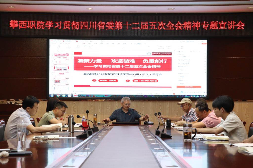 5月23日下午,开云在线登录召开2024年第5次理论学习中心组(扩大)学习会,专题学习省委十二届五次全会精神。学校书记万辉君、院长潘吉平、副院长邹永亮等校领导出席学习会,会议由宣传统战处处长余晋主持。