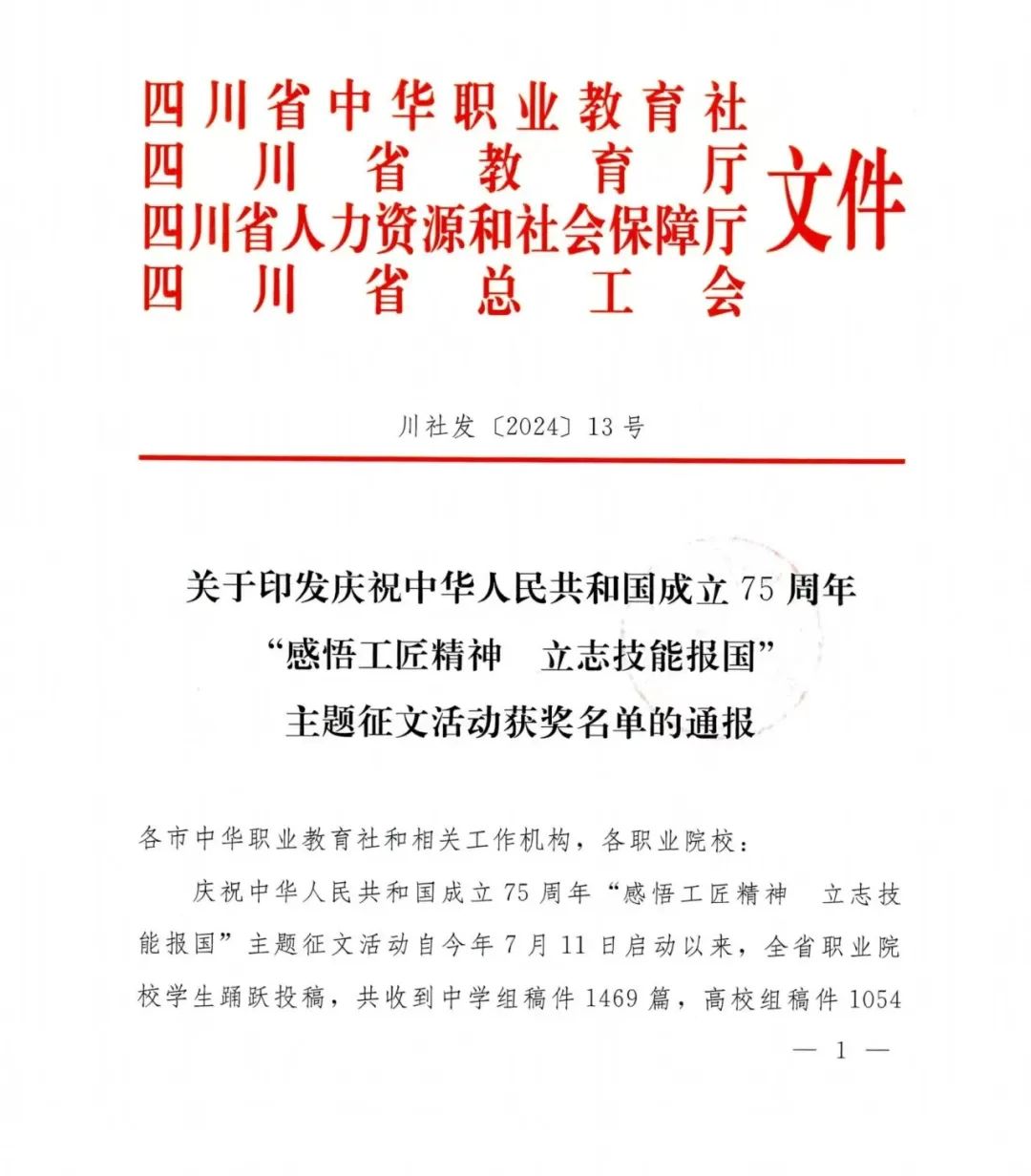 在四川省中华职业教育社、四川省教育厅、四川省人力资源和社会保障厅、四川省总工会开展的庆祝中华人民共和国成立75周年“感悟工匠精神 立志技能报国”主题征文活动中,开云在线登录学生以极高的创作热情,从全省高校组1054名参赛选手中脱颖而出,喜创佳绩。