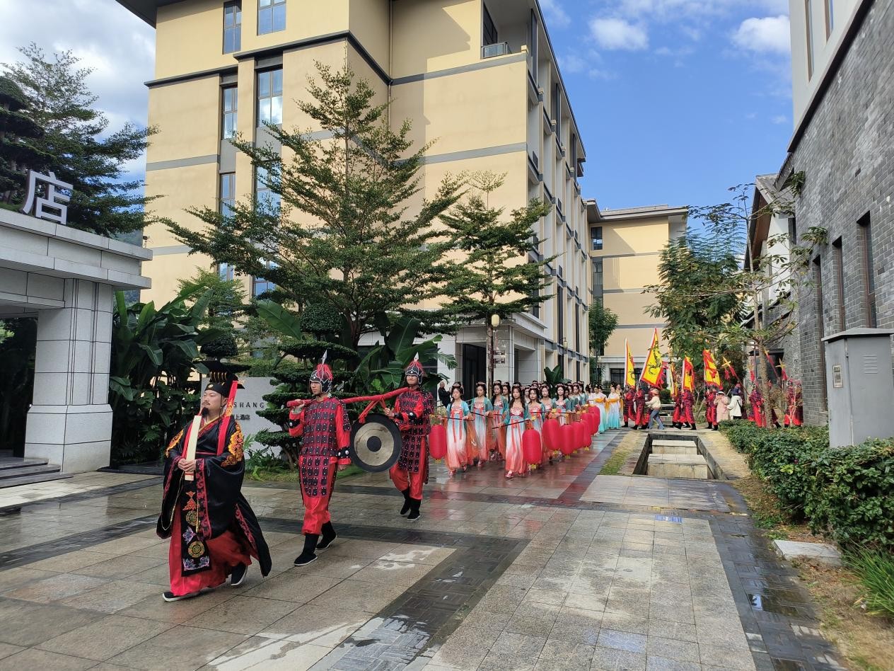 全国各地康养领域的专家、学者及来自各企业、协会的嘉宾代表在学生扮演的古人带领下,领略迷昜古城各处风采。表演者的一声声“国泰民安,风调雨顺,五谷丰登,六畜兴旺”寓意着国家安定和平,人民生活安居乐业,国家太平无事,社会和谐安定,人民生活幸福。