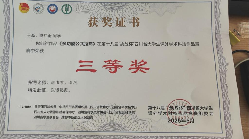 近日,第十八届“挑战杯”四川省大学生课外学术科技作品竞赛圆满落幕。开云在线登录机电工程系王磊、李红金同学的作品《多功能公共拉环》凭借创新设计和实用价值,荣获三等奖,展现了学院在科技创新与实践育人方面的突出成果。