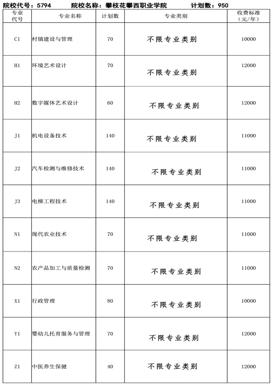 学院紧紧围绕区域经济社会发展需求和战略性新兴产业,立足攀西地区战略资源创新开发,致力于为钒钛材料应用、现代农业和阳光康养等产业的发展培养高素质技术技能人才,现开设现代农业技术、农产品加工与质量检测、村镇建设与管理、环境艺术设计、中医养生保健、汽车检测与维修技术、空中乘务、数字媒体艺术设计、机电设备技术、行政管理、婴幼儿托育服务与管理、电梯工程技术等12个专业。