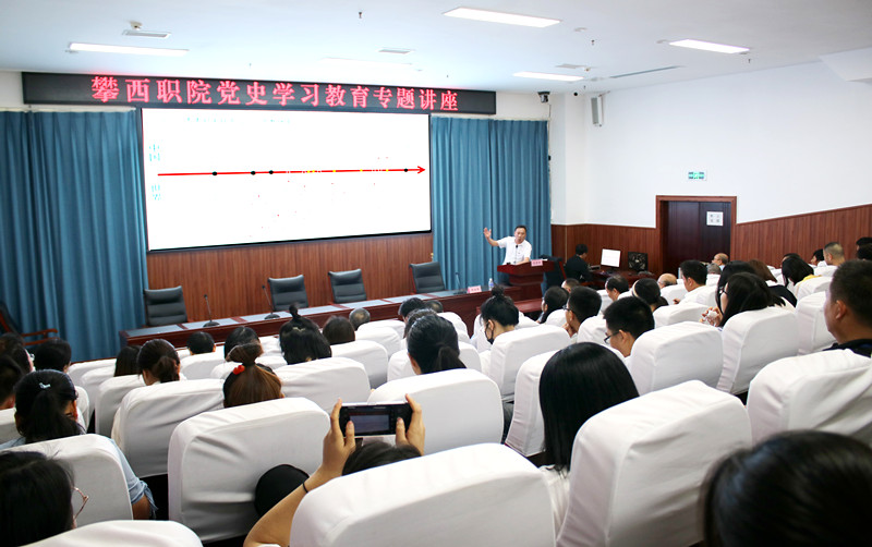 为庆祝中国共产党成立100周年,扎实开展党史学习教育,2021年6月4日下午3点,攀西职院基础教学与公共管理系主任、攀枝花市米易县党史学习教育宣讲团成员伍亚林在二实训楼阶梯教室作“党史学习教育之真信笃行”专题讲座。学院全体党员、中层以上干部、全体教职员工参加讲座。党史学习教育办公室主任周荣辉主持讲座。
