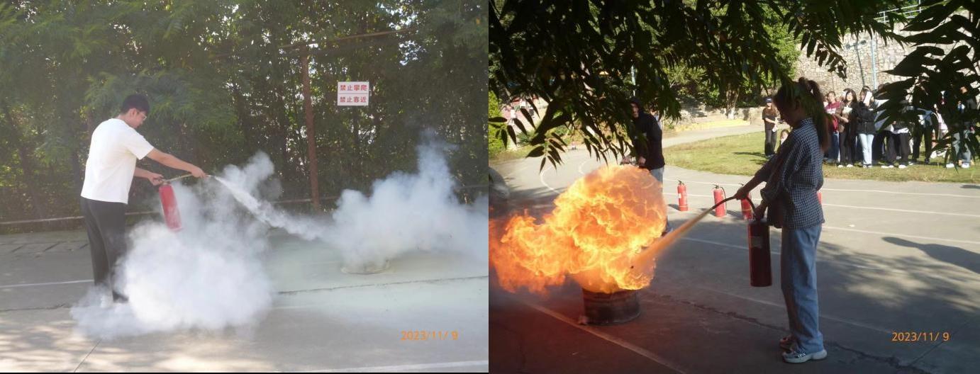 讲座后,集合同学们进行消防器材的实操。倪继成先对消防器材的灭火原理和安全注意事项进行讲解,并亲自演示使用干粉灭火器灭火的操作方法。随后,部分同学体验实操。通过实操体验提高了同学们使用消防器材扑灭初起火灾的能力。