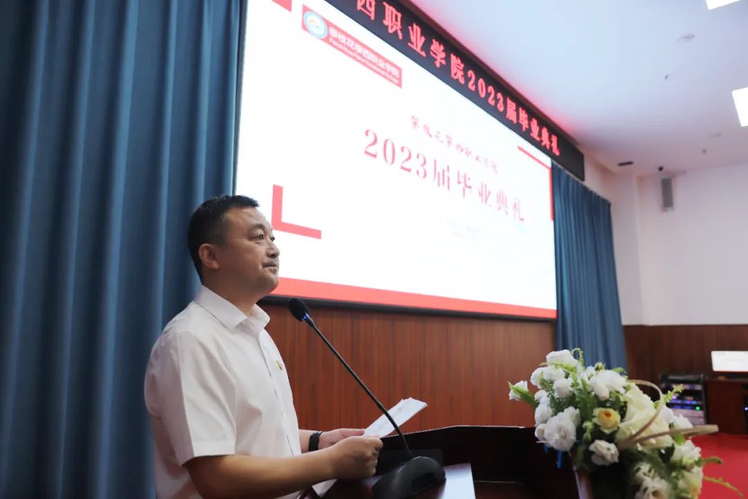 院长刘国钦讲话,他代表学院党政和全校师生员工向顺利完成学业的2023届毕业生表示热烈祝贺。他对同学们提出四点希望:一是不忘初心、牢记使命,做一个有担当的人。二是思行结合、躬身实践,做一个实干的人。三是乐观向上、百折不挠,做一个开朗的人。四是心怀眷恋、相伴永远,做一个感恩的人。