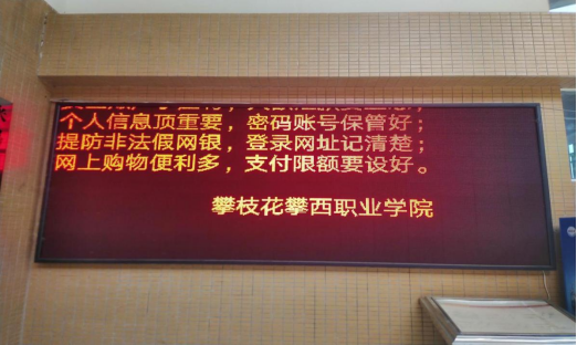 攀西职院后勤保卫处利用LED在学院内宣传,辅导员利用QQ、微信及展板再次对学生进行防电信网络诈骗相关知识宣传。