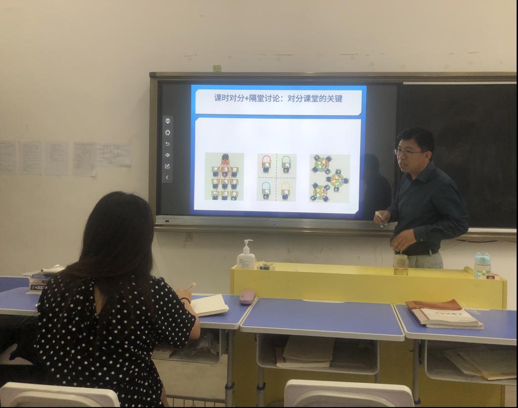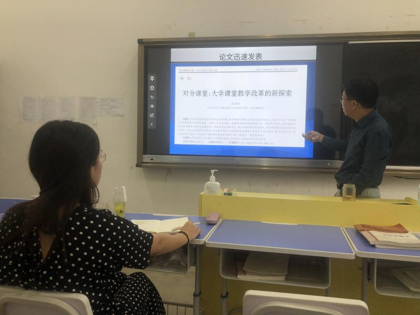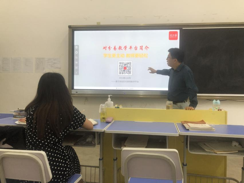 本次教研活动中,郑主任首先介绍了“对分易平台”建设的背景和发展历程,并在多媒体上演示了如何使用对分易平台,并详细讲解了平台中的班级学生管理、作业、考勤统计、分组、课程资源、在线练习、讨论区、课堂提问、调查问卷、投票、活动、成绩册、微信消息、教学评价等课程教学功能。