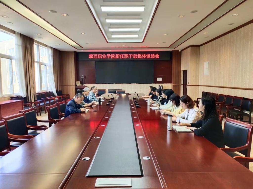 2022年10月27日上午,攀西职院在二实训楼四楼会议室召开新任职干部集体谈话会。学院领导万辉君、赵海林、李玉德出席会议,学院组织人事处曾祥明、马小林及新任干部参加会议。会议由组织人事处主持。
