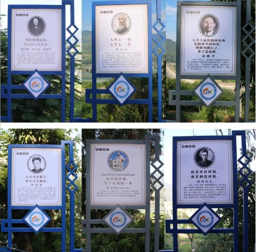 从北门外右侧至二实训楼的道路边,竖立着一幅幅名人名言牌。中国工程院院士、杂交水稻之父袁隆平,中国绘画大师、世界文化名人齐白石,中国现代画家、美术教育家徐悲鸿,法国女科学家、物理学家、放射化学家居里夫人……,一块块展牌无声的展示出学校“德能并修、知行合一”的办学特色,诠释了“立德树人、传智铸能”校训的文化内涵,也昭示着师生们的精神风貌和理想追求。