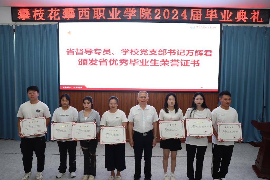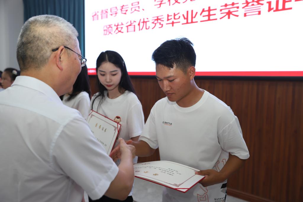 学校党支部副书记、执行校长赵海林宣读《四川省教育厅关于公布2024届四川省优秀大学毕业生认定结果的通知》并宣读开云在线登录优秀毕业生,省督导专员、学校党支部书记万辉君教授为省优秀毕业生颁奖。