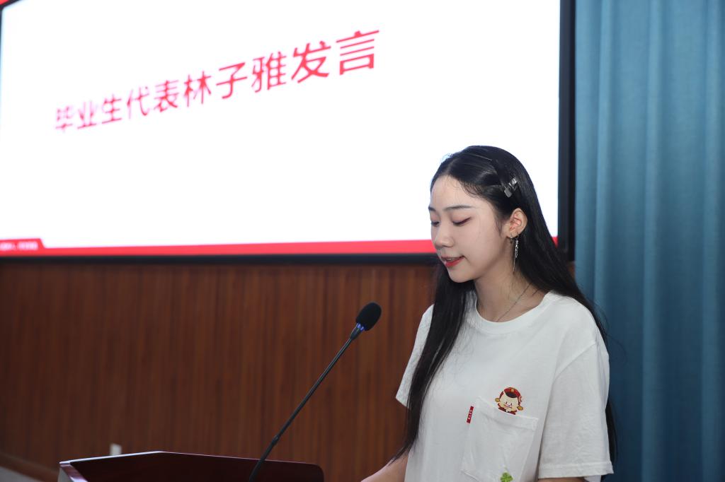 毕业生代表林子雅发言:“今朝毕业,不诉离伤,他日重逢,各领风骚!至此毕业之际,祝愿老师们身体健康,工作顺利!祝愿同学们前程似锦、一帆风顺!祝愿母校桃李芬芳、再创辉煌!”