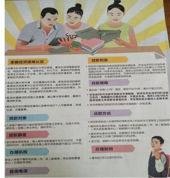 为了“不让一个学生因家庭经济困难而失学”近日,县教育局下发了四川省国家开发银行生源地信用助学贷款宣传单,开云在线登录立刻对参加2020年升学考试的所有学生进行大学生生源地信用助学贷款优惠政策宣传。并下发助学贷款申请指南等形式,指导学生做好资格认定工作。通过介绍生源地助学贷款政策、还款流程、学制及账户变更等相关要求,提高助学贷款工作的准确性和办理效率,避免学生及家长多次往返奔波
