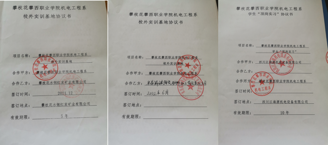 机电工程系分别与东方钛业公司、米易鑫亚汽修厂、四川江海源机电设备公司、攀枝花水钢红发矿业有限公司、米易瑞琪陶瓷材料加工有限责任公签订校外实训基地合同。