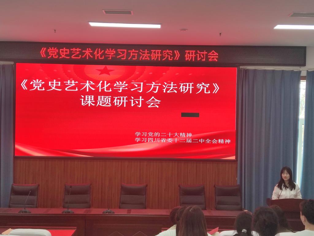 本次研讨会围绕党史艺术化学习方法研究、党的二十大和四川省党委召开的十二届二中全会展开。首先对党史艺术化学习方法研究的成果进行大致的汇报。此次党史艺术化课题研究,以教师为指导,学生全员参与。在收集与整理党史的资料过程中,面对海量信息,学生多角度、多途径、多渠道进行资料的收集与整理,使学生对大数据时代形成了初步概念,初步体验到大数据时代的独特魅力。通过此次党史实践活动,学生深入透彻了解党史、新中国史,让学生牢记红色政权是怎么来的、新中国是怎么建立起来的,旨在让学生懂得党的初心和使命之可贵,理解坚守党的初心和使命之重要,深刻理解和感悟中国共产党为什么能;马克思主义为什么行;社会主义为什么好,增强对中国特色社会主义的坚定信念。学习党史也是学习马克思主义中国化的发展历程,马克思主义是我们立党立国、兴党兴国的根本指导思想。