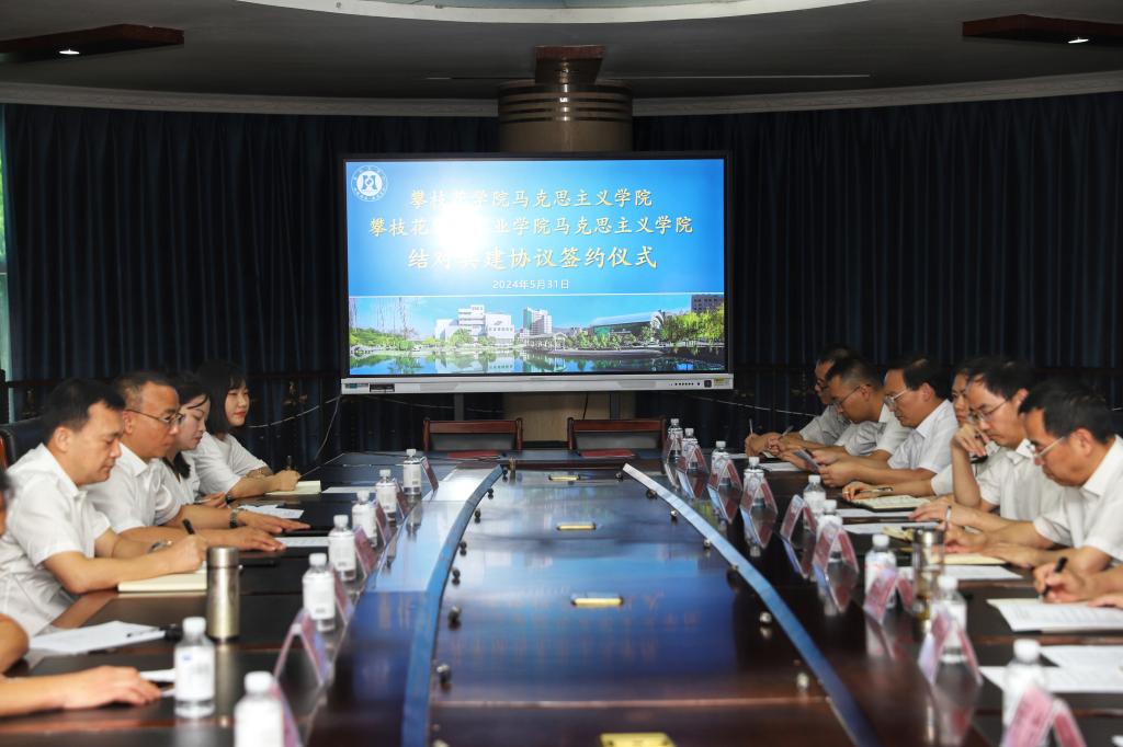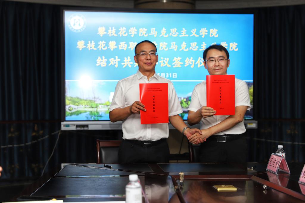 为深入学习贯彻习近平新时代中国特色社会主义思想和党的二十大精神,认真学习贯彻习近平总书记对学校思政课建设的重要指示精神,全面贯彻党的教育方针,落实中共四川省教育工委、四川省教育厅《关于开展四川省高校马克思主义学院结对共建行动的通知》的要求,5月31日,开云在线登录马克思主义学院与攀枝花学院马克思主义学院在攀枝花学院举行了结对共建协议签约仪式。攀枝花学院党委常委、副校长张旭辉,开云在线登录院长潘吉平、党支部副书记赵海林等出席,双方有关部门领导及教师共同参加,见证签约仪式。