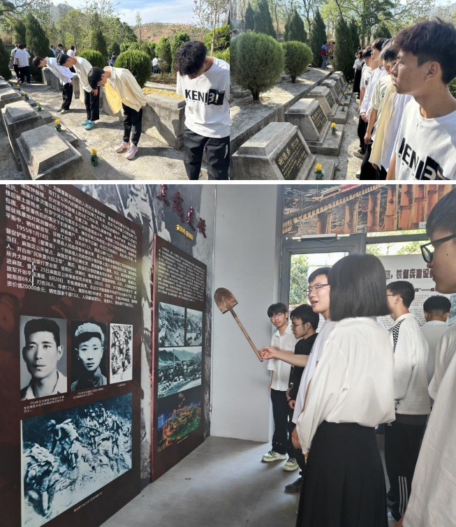 在张妮老师引领下,师生们肃立在烈士纪念碑前,深深鞠躬并向烈士纪念碑献花,表达对英雄们的崇高敬意和无尽的哀思。接着,师生们跟随解说员走进墓地,这些烈士墓仿佛也在静静地讲述着先烈们的故事,激励着同学们铭记历史,珍惜和平,为中华民族的伟大复兴贡献自己的力量。最后,师生们来到纪念馆,参观了展出的历史文献和珍贵图片。这些文献和图片生动地展示了革命历史的艰辛与伟大,让师生们更加直观地感受到先烈们为国家和民族付出的巨大牺牲。