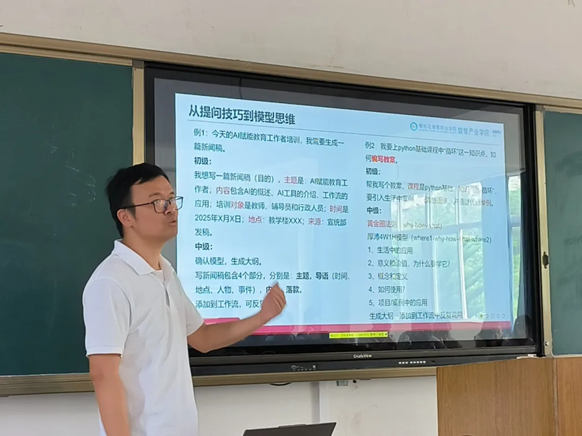 接着,何舸老师以“AI赋能教育工作者”为主题,讲解了人工智能技术如何助力教育教学,实现人机协同、减负增效的智能工作新模式。他一边操作AI应用软件,一边通过具体事例展示了AI技术在教学管理、教学准备、教学过程中等方面的应用,激发了教师们对智能教育新形态的深入思考,助力大家在教学工作中应用人工智能技术开拓工作思路,学习先进职教理念,创新发展教育教学工作。
