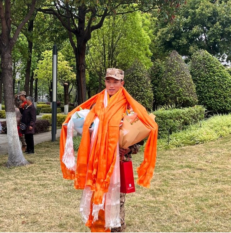 辅导员潘老师代表学院向泽郎李罗同学表示祝贺,并勉励他在军营中锤炼意志、增长才干:“参军报国是当代青年的崇高追求,希望你能发扬‘健康人’坚韧不拔的精神,在部队大熔炉里成长为有担当、有本领的新时代军人。”学生代表则送上饱含祝福的哈达和鲜花,感慨道:“泽郎李罗同学一直是我们的榜样,他主动投身国防的选择让我们深受鼓舞!”