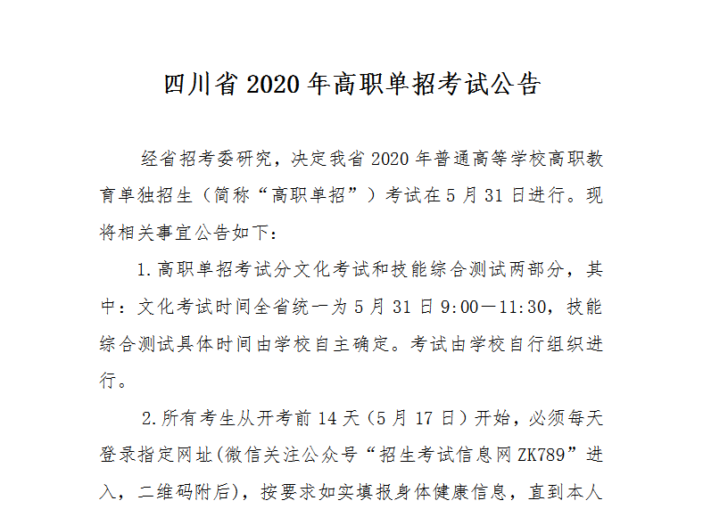 四川省2020年高职单招考试公告