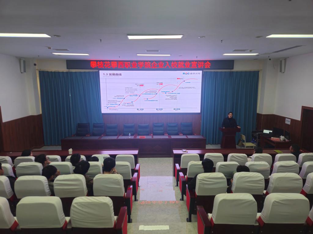 紧接其后的企业入校宣讲会现场气氛热烈非凡。各大参会企业通过精心制作的 PPT、宣传视频,全方位展示了企业的发展历程、企业文化、核心业务以及广阔的职业晋升通道。睿恩光电的 招聘负责人周萍作为企业代表发言,分享了企业对于实习生培养的重视与投入,承诺为学生提供丰富的实践机会与专业指导,引得台下学生们掌声不断,眼神中满是对实习生活的憧憬与期待。
